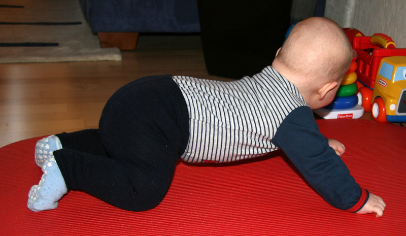 I now regularly stand on my arms and knees a few seconds at a time, but I have not figured out how to synchronize my arms and my knees to move myself forward. Here are some pictures of me trying